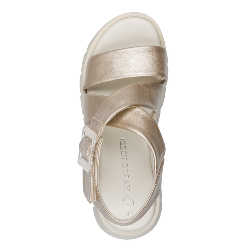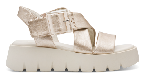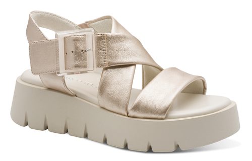 • Step out in confident style with this modern platform sandal from Marco Tozzi, expertly designed to deliver sophisticated comfort for all-day wear. Finished in a sleek platinum colour, this sandal adds a contemporary edge to both casual and dressed-up summer looks.