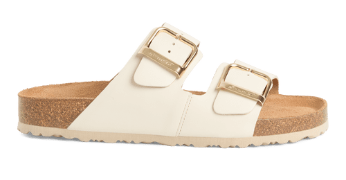 White sandal with gold buckles on a white background