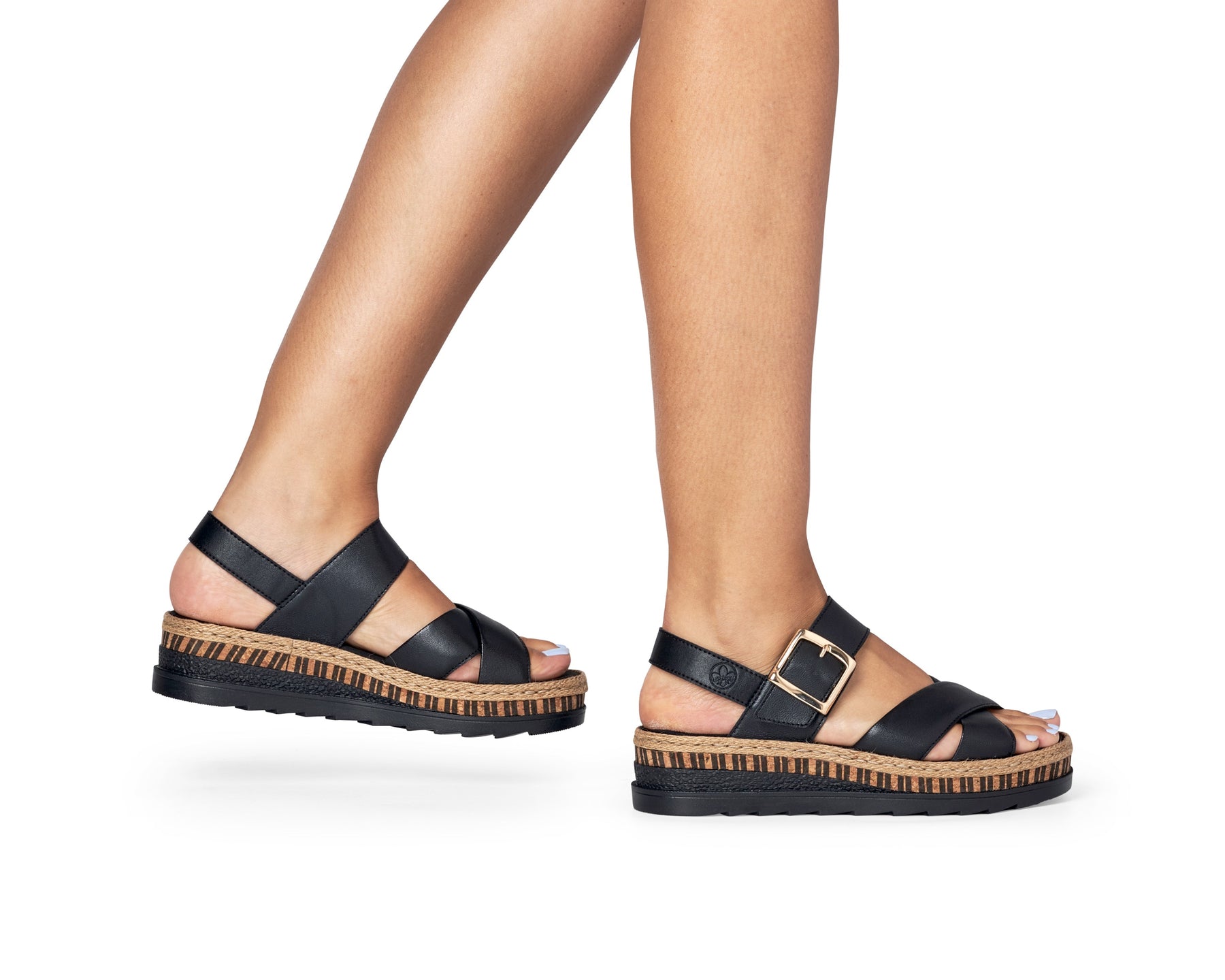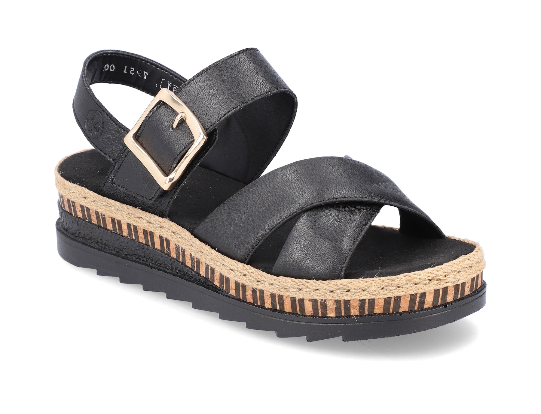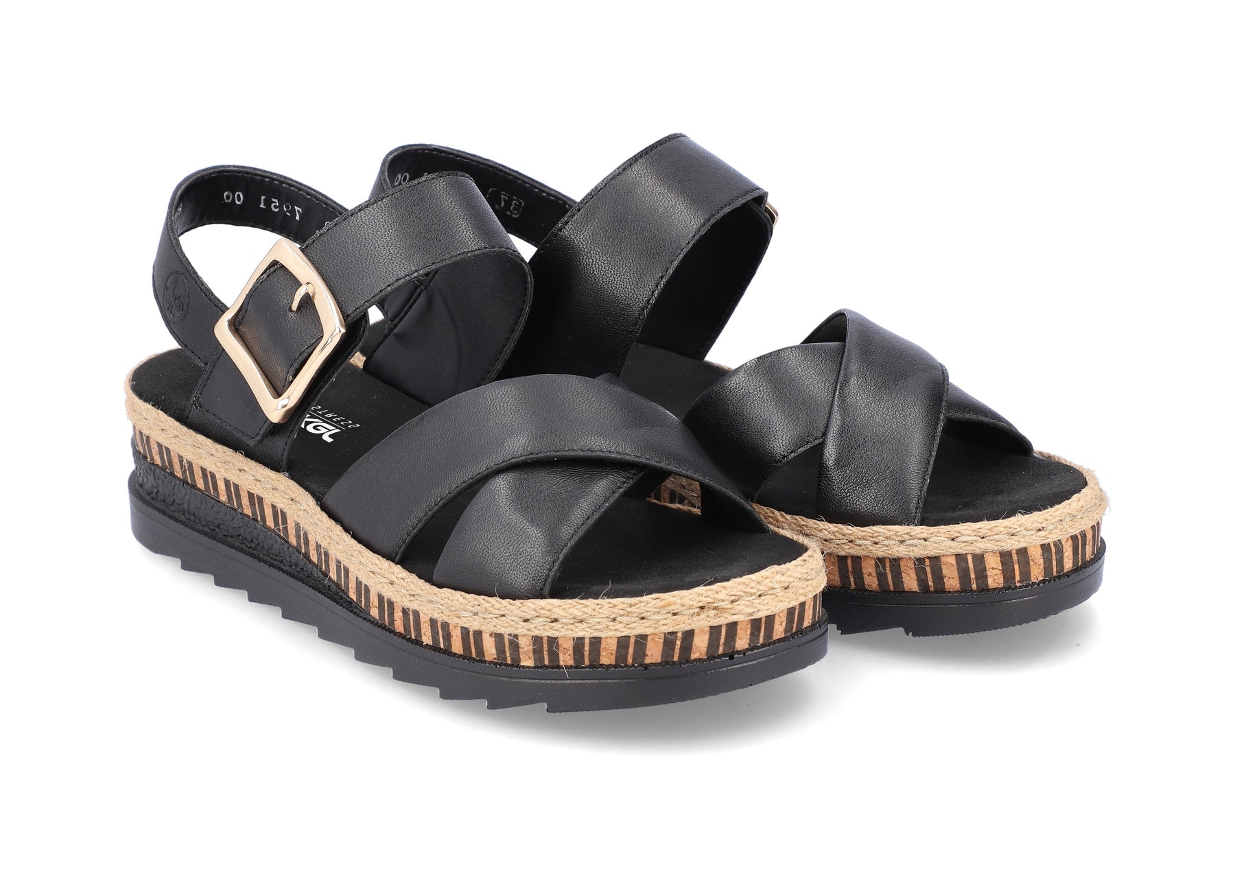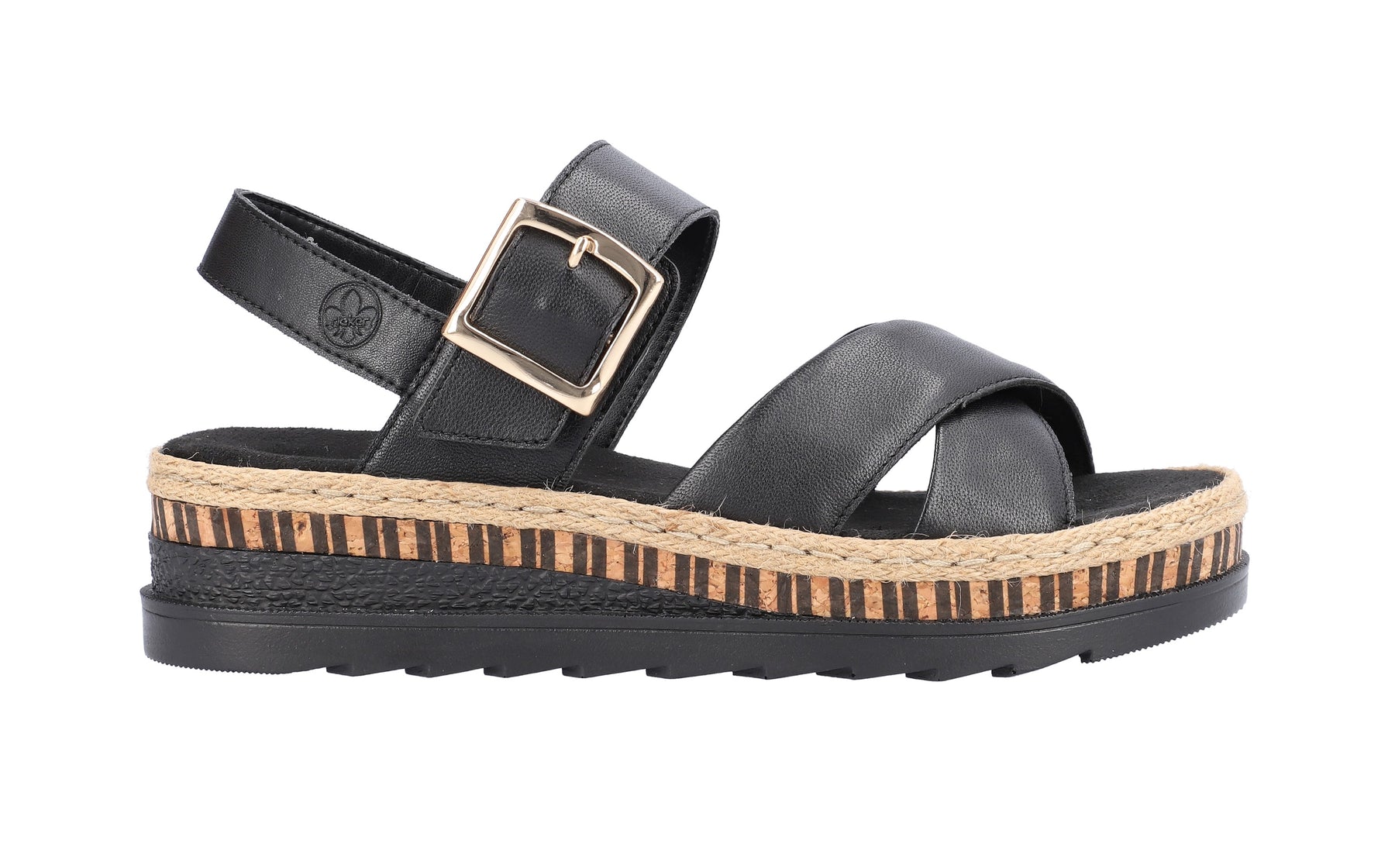 Crafted with Rieker’s renowned comfort technology, this women’s wedge sandal is lightweight, flexible and supportive, helping to reduce foot fatigue throughout the day. The sleek black finish ensures maximum versatility, pairing beautifully with dresses, trousers or summer skirts, while the stable wedge sole provides added confidence with every step.