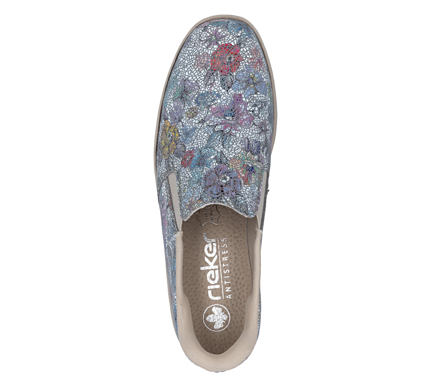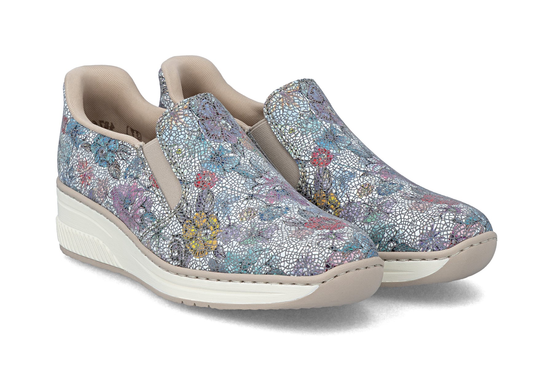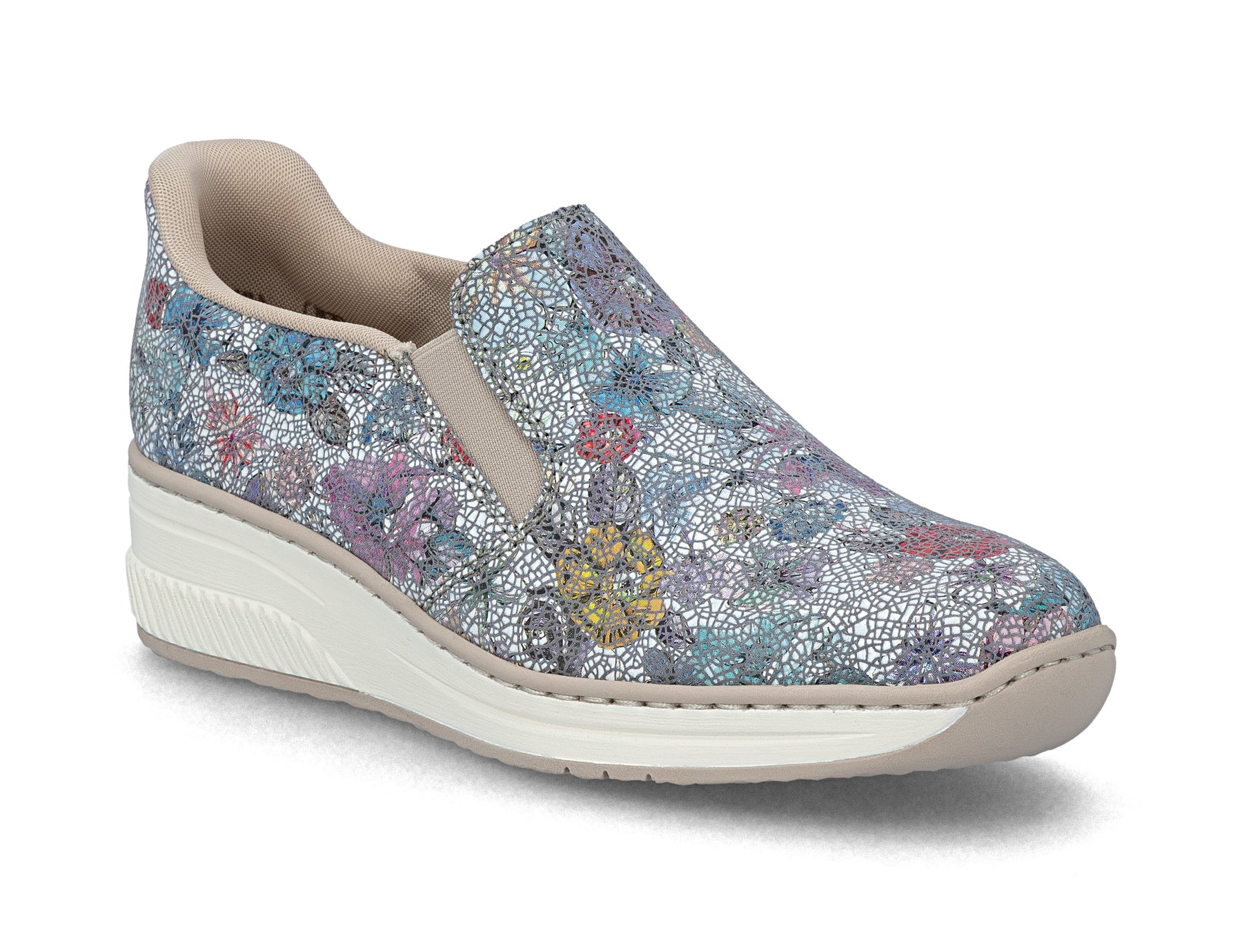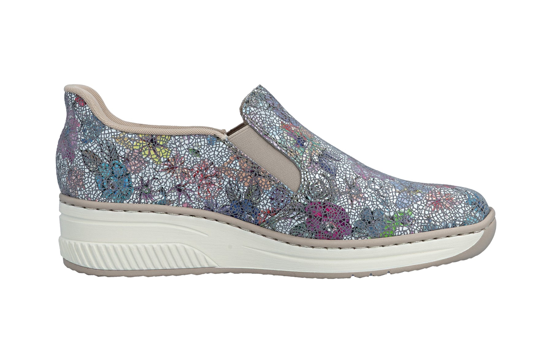 Floral patterned slip-on shoe with Rieker branding on a white background