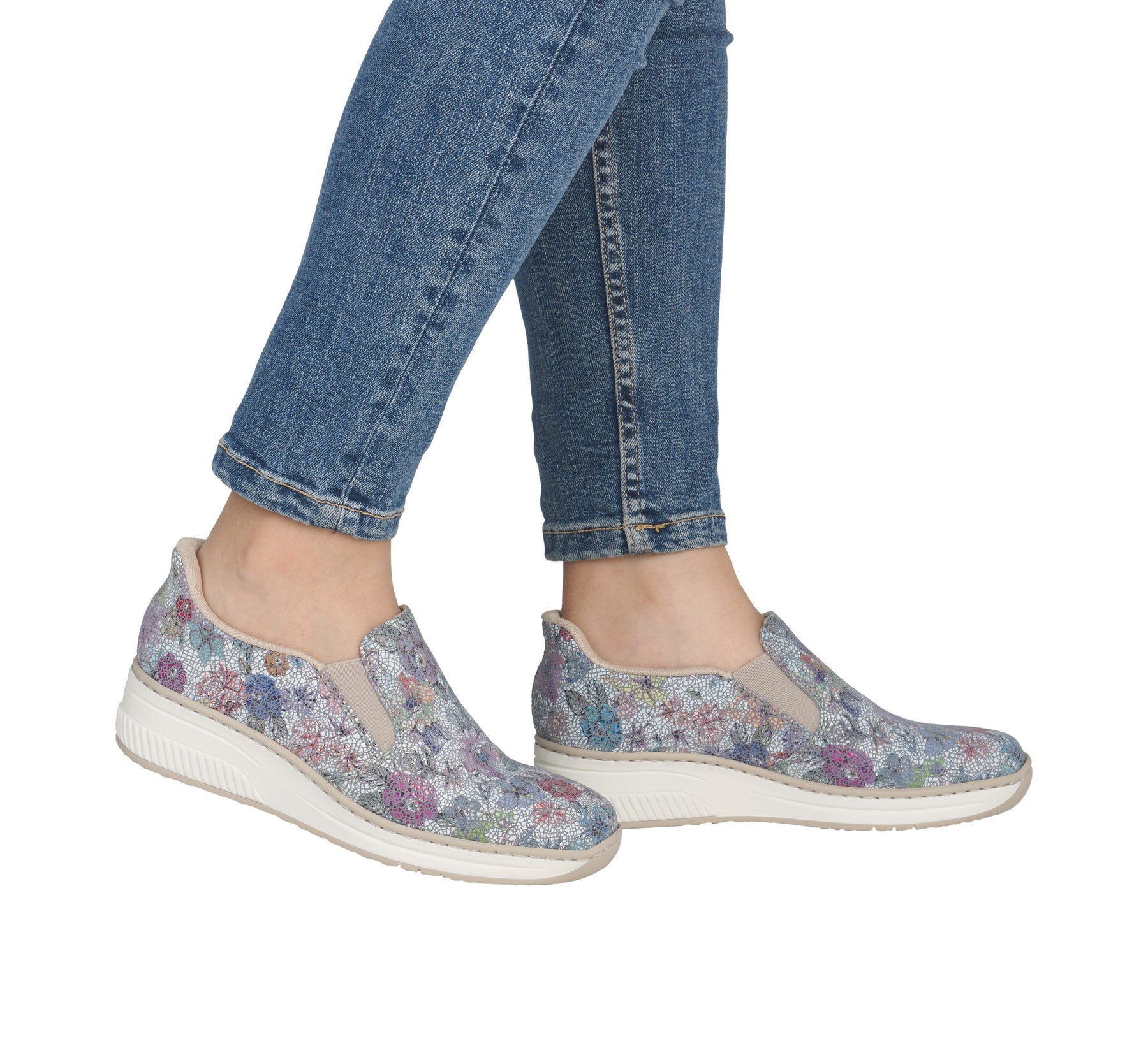 Floral slip-on shoes worn with blue jeans on a white background