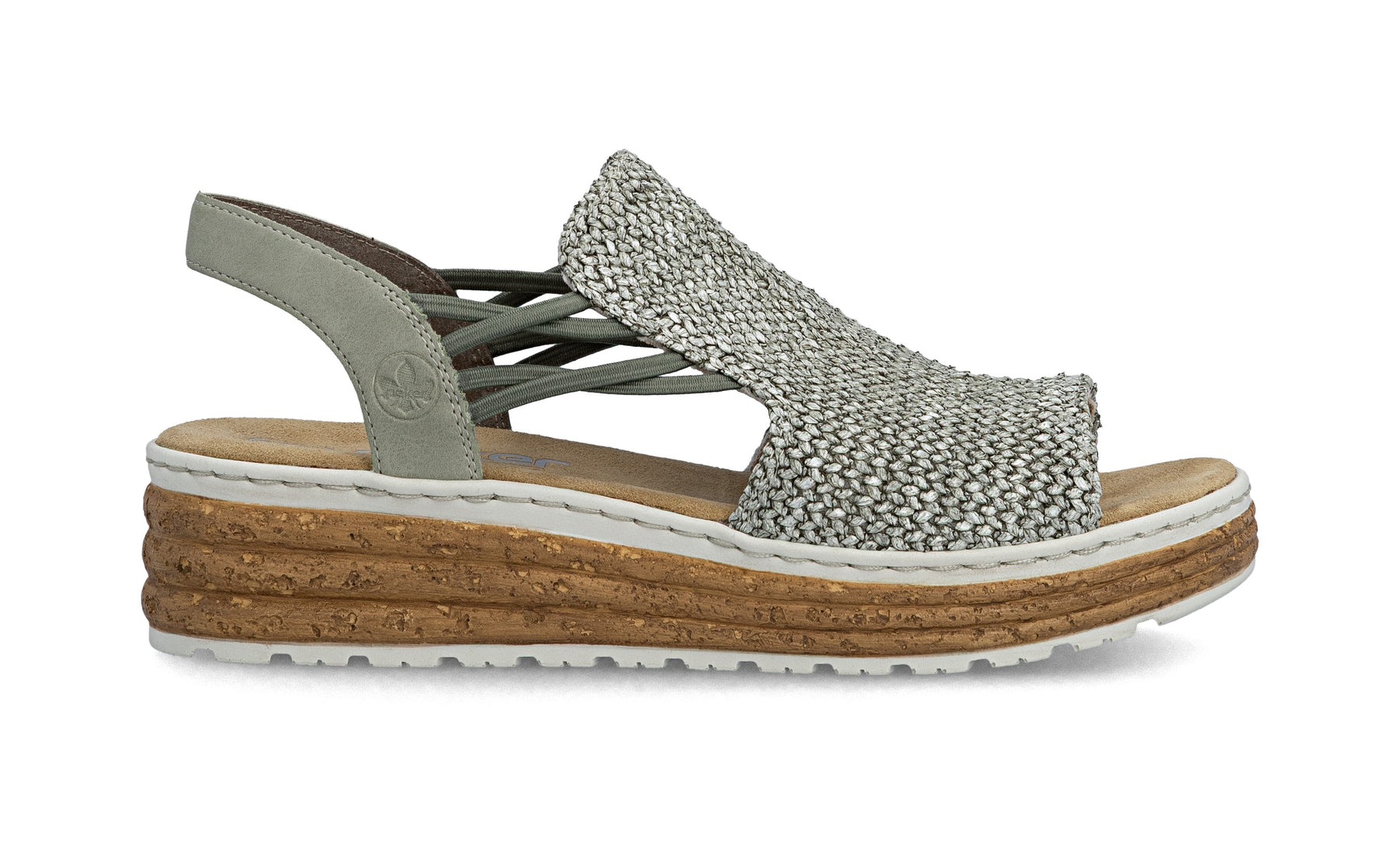 Silver wedge sandal with cork sole on a white background
